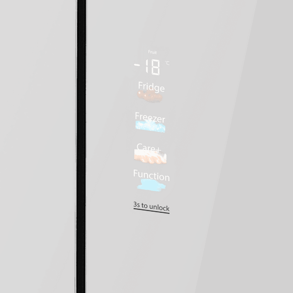 На сенсорной панели удобно выбирать температуру камер и режимы — Fast Cooling, Fast Freezing и ECO — а блокировка от случайных нажатий делает использование безопасным. При этом холодильник остаётся комфортным в быту: уровень шума 39 дБ подходит для кухни-гостиной.