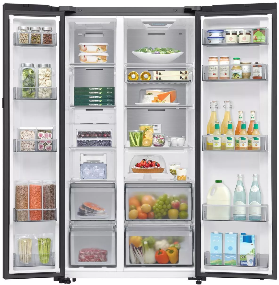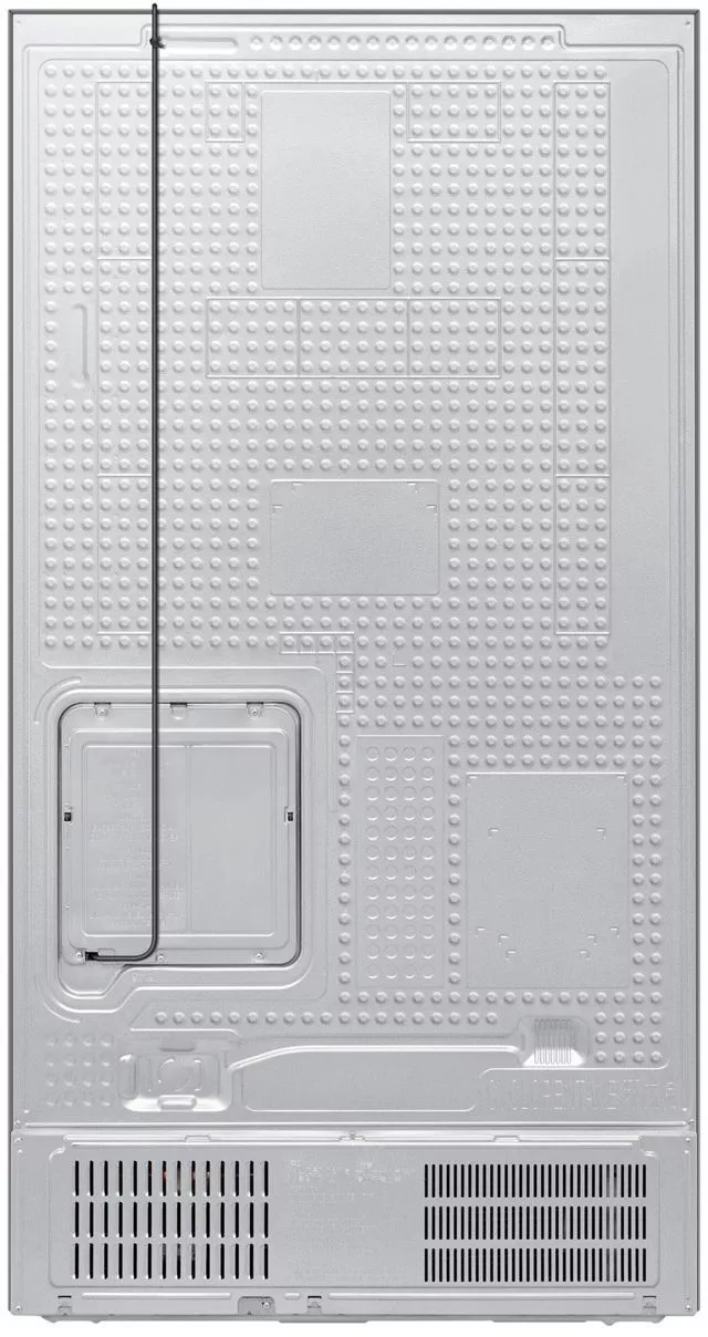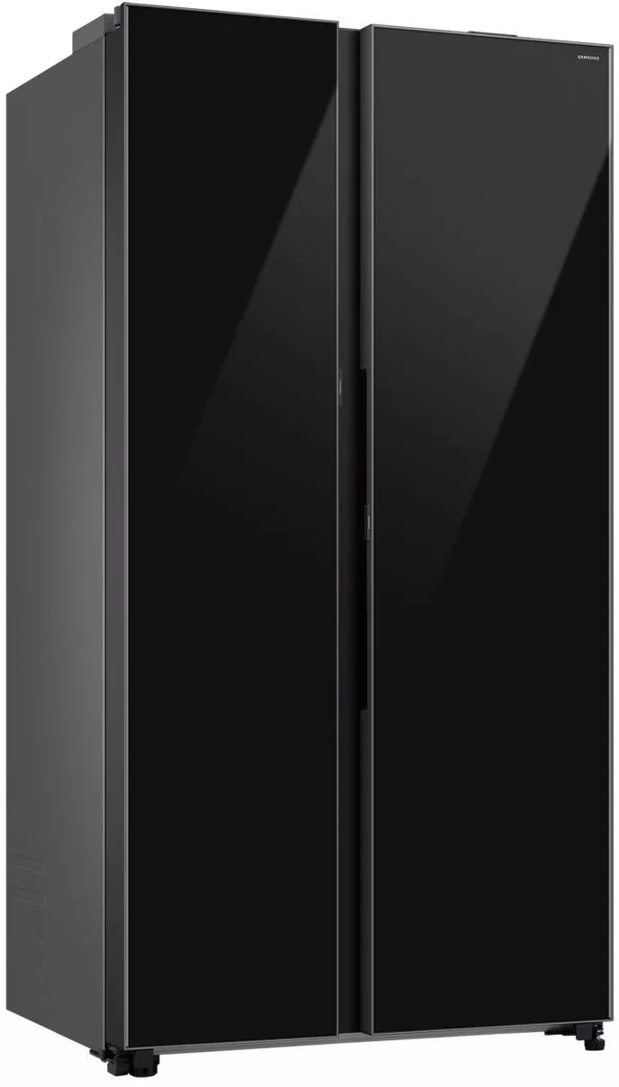 Управление осуществляется как с внутренней электронной панели, так и дистанционно через приложение SmartThings с поддержкой Wi-Fi и Bluetooth. В холодильной камере — 4 полки из закаленного стекла (с фиксаторами против выдвижения), 5 дверных карманов, полка для бутылок и 2 ящика для овощей и фруктов. В морозильной камере — 4 полки, 5 дверных карманов и 2 прозрачных пластиковых ящика. Обе камеры оснащены светодиодным освещением и индикацией температуры.